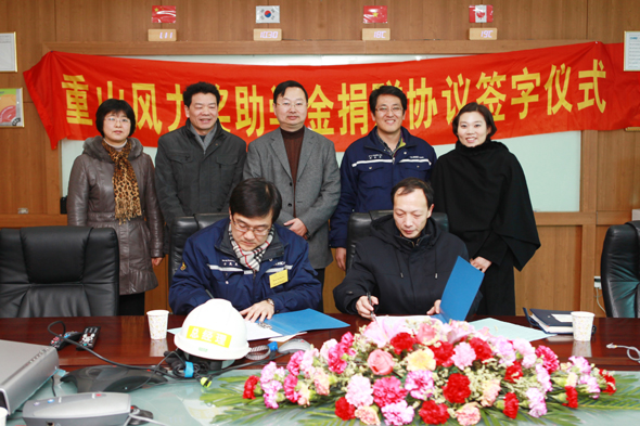 2013年1月11日上午,淮海工學(xué)院黨委副書(shū)記、副院長(zhǎng)寧曉明帶領(lǐng)學(xué)生處和外國(guó)語(yǔ)學(xué)院領(lǐng)導(dǎo)以及韓國(guó)語(yǔ)系負(fù)責(zé)人一行5人來(lái)到我公司洽談校企合作事宜,并出席“重山風(fēng)力獎(jiǎng)助學(xué)金”捐贈(zèng)儀式。我公司總經(jīng)理方晟焄和該校領(lǐng)導(dǎo)王聿良、湯洪濤分別代表雙方簽訂了“重山風(fēng)力獎(jiǎng)助學(xué)金”捐贈(zèng)協(xié)議書(shū),寧曉明同志代表淮海工學(xué)院接受捐助款十萬(wàn)元。
