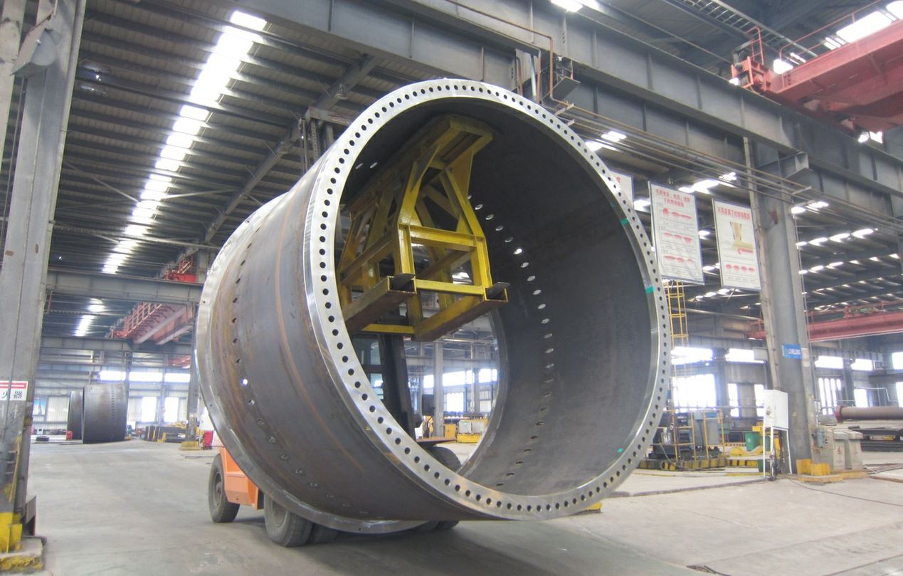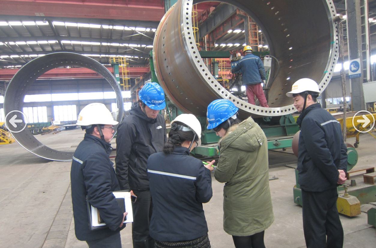 2015年3月2日,日立項(xiàng)目基礎(chǔ)環(huán)部分正式開(kāi)始鋼板切割工作。圖為:黑塔工人將第一件對(duì)接完成的基礎(chǔ)環(huán)運(yùn)往埋弧焊生產(chǎn)線。 2015年3月6日,日立上海工程師 安川浩祐 / YASUKAWA,KOSUKE和林曉詠 /Lin Xiaoyong 到訪我公司。圖為二位工程師在黑塔車間就焊接問(wèn)題與我公司技術(shù)組交流意見(jiàn)。