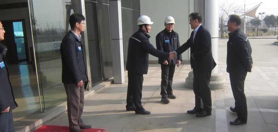圖為:中國(guó)工廠領(lǐng)導(dǎo)層迎接 金社長(zhǎng)(右二)的到來(lái)