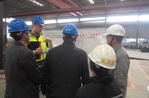 圖為:Mr. Richter(左二)在卷板、縱縫焊接工序詢問(wèn)工作指導(dǎo)事宜