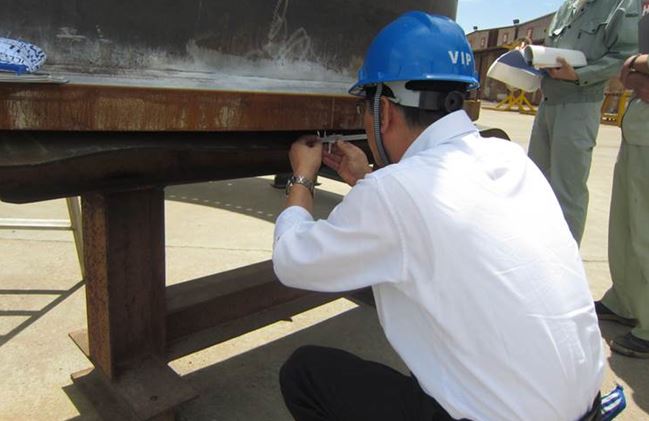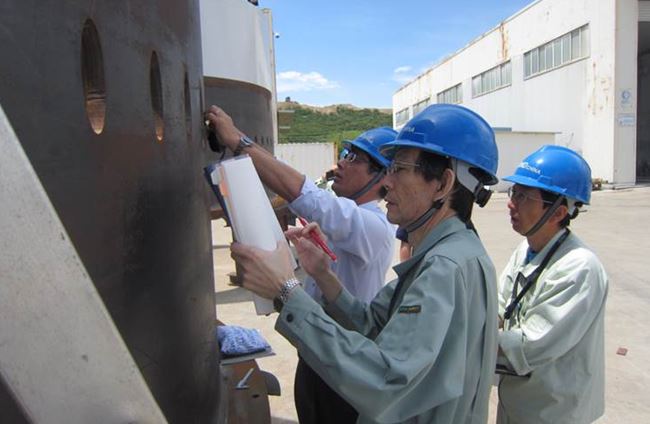 圖為:業(yè)主代表KAZUHIKO OKUMOTO(左一)檢驗法蘭孔直徑