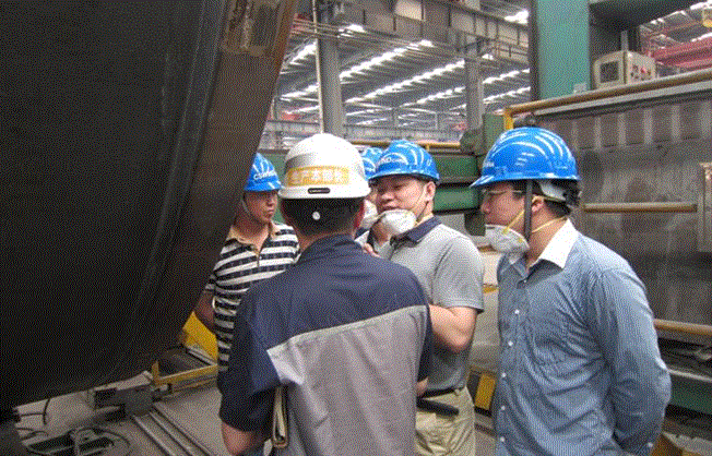 圖為:錢正宏經(jīng)理(右二)一行在黑塔車間埋弧焊生產(chǎn)線