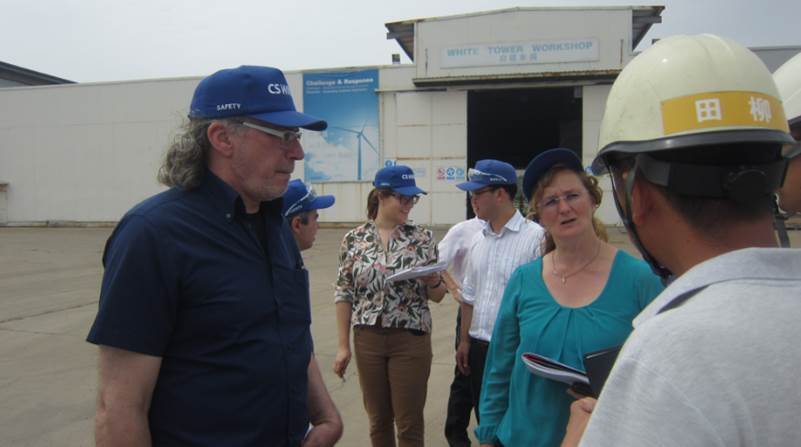 圖為:Senvion 商務(wù)組Ines-Maria Frodl(右二)和Obrien Peter(左一)向生產(chǎn)經(jīng)理了解組裝相關(guān)