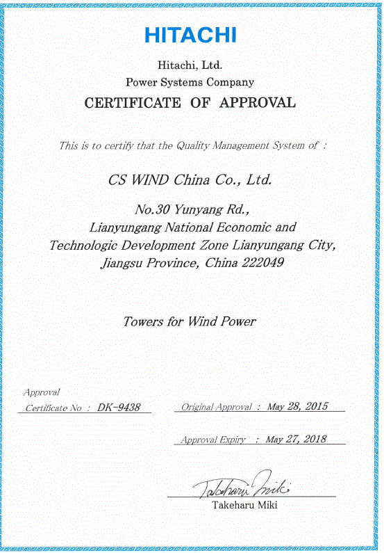 繼2015年5月底審核之后,6月16日,我公司正式獲得日立電力塔架供應(yīng)商認(rèn)證。此次認(rèn)證是對(duì)我公司上半年工作的極大肯定,同時(shí)也是重山風(fēng)力集團(tuán)與日立電氣在全球范圍內(nèi)全面展開(kāi)合作邁下的堅(jiān)實(shí)一步。